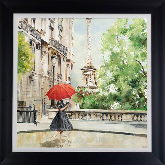Paris Walk by Allison Pearce Image is 26.5 x 26.5 Outside Frame Size is 33 x 33 Hand textured on wood. Sleek black 3 inches frame with white linen liner. Ready to hang